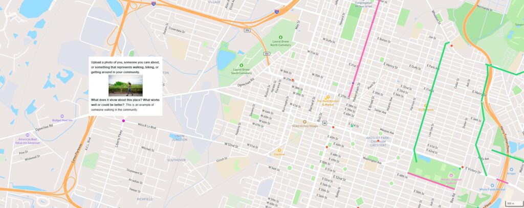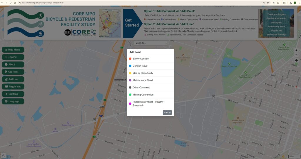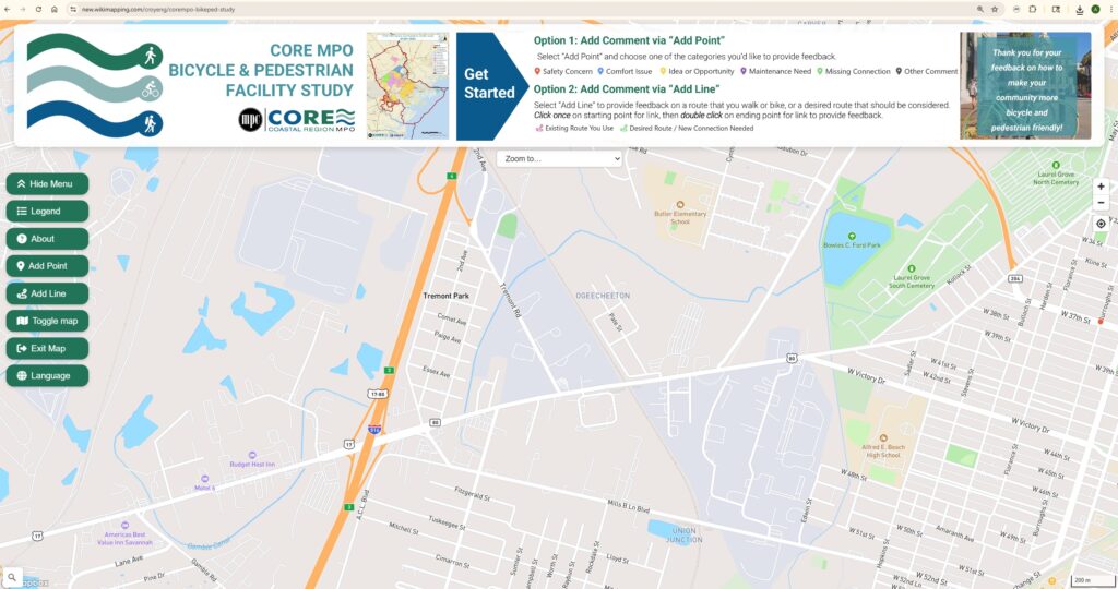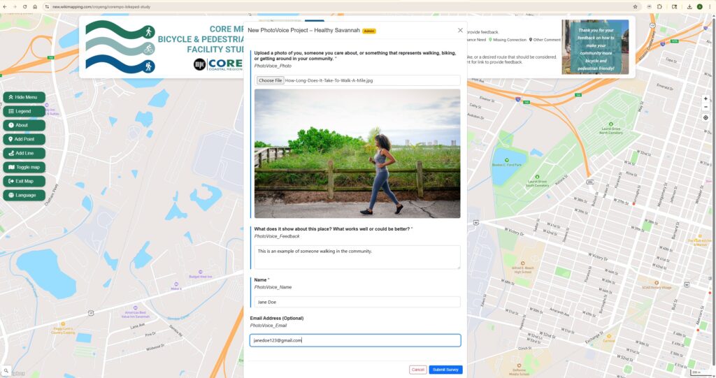 Submit your photos using the CORE MPO Bike-Ped WikiMap. First, you drop a pin. Then, you upload a photo, add a short comment about the location, and include your name and email. Your email address will not be publicly visible. It will only be collected on our end.